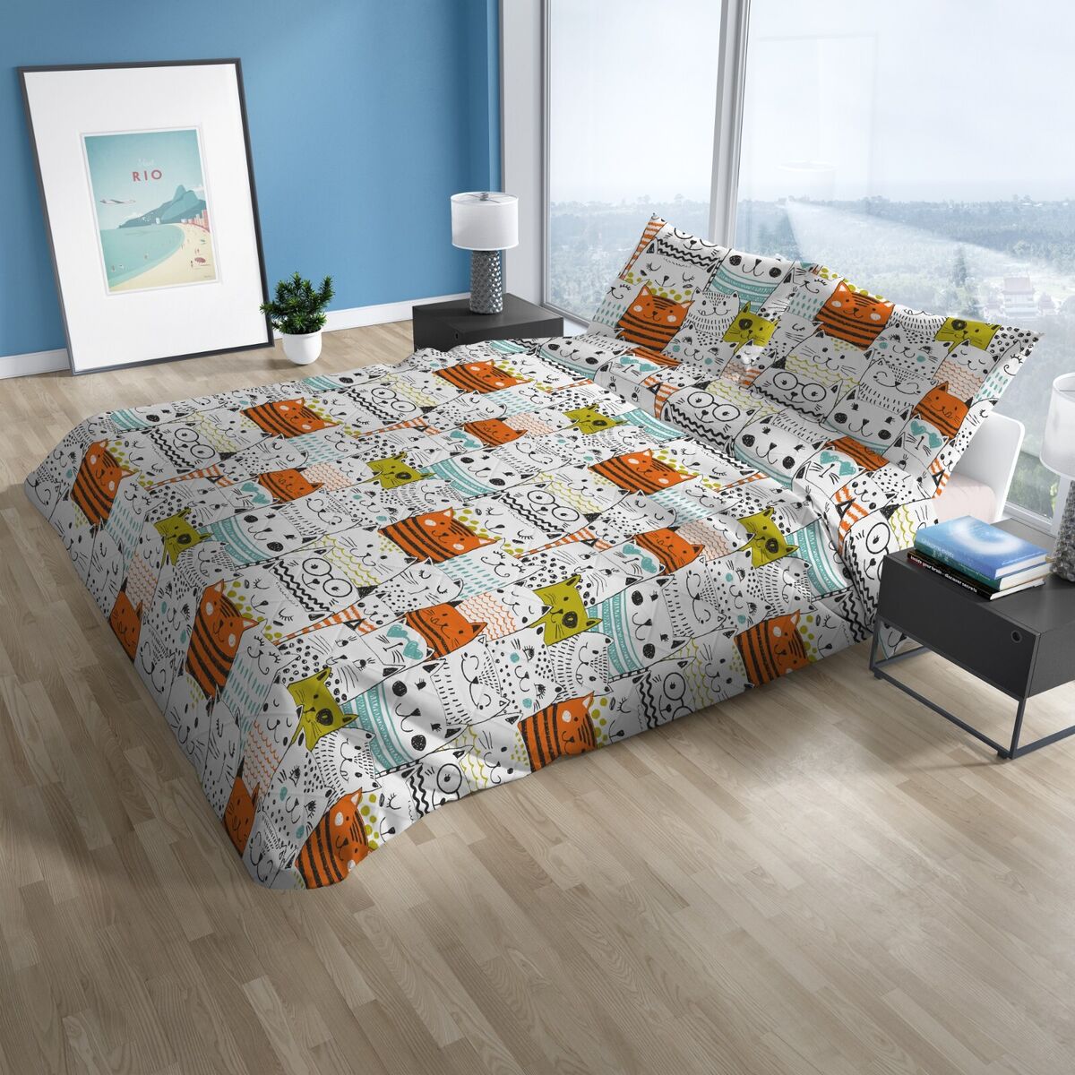 PARURE COPRIPIUMINO SINGOLO LINEA QUADRIFOGLIO , CON STAMPA DI GATTI.