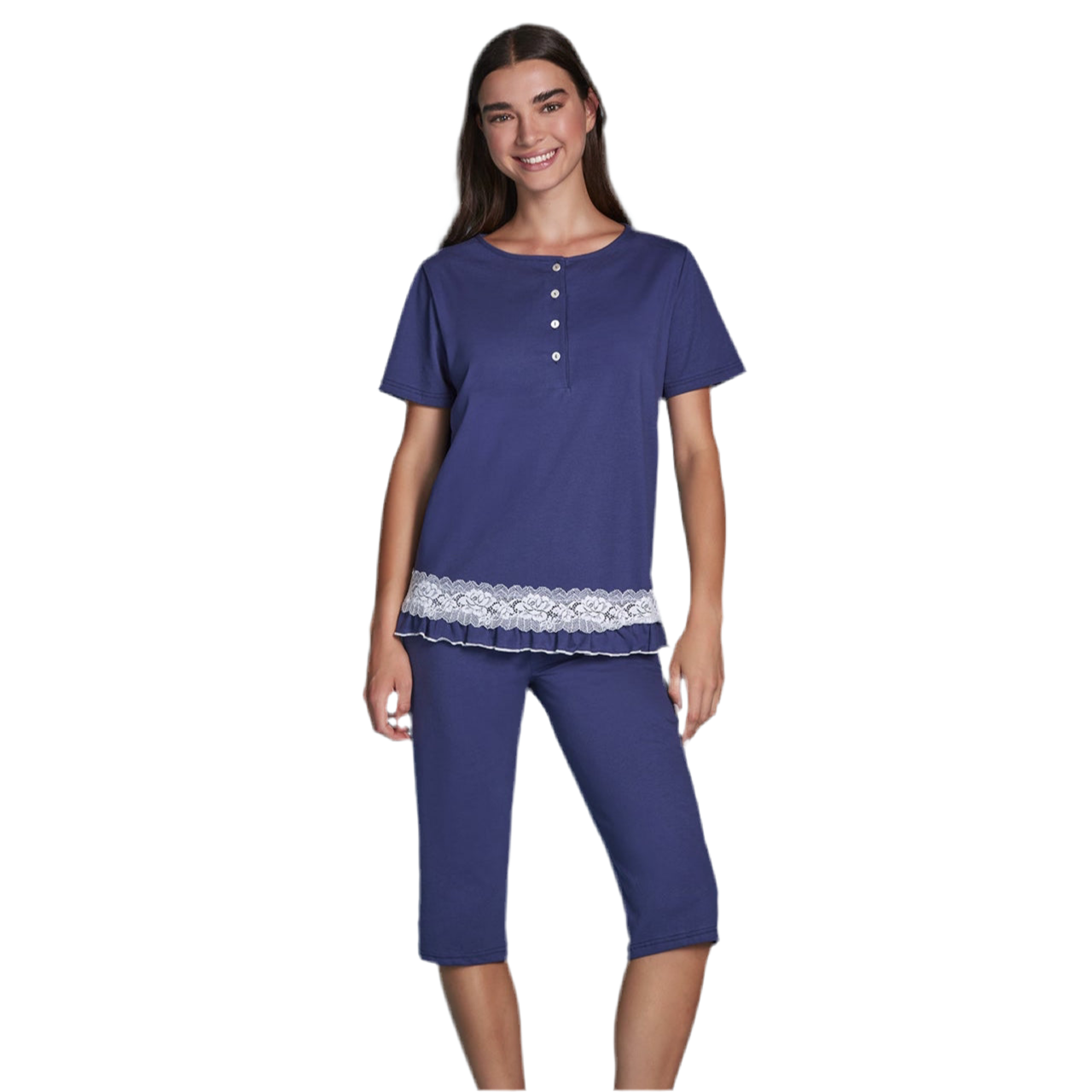 Pigiama con pantalone pinocchietto e maglia a manica corta modello serafino. Realizzato in puro cotone ed impreziosito da una balza in pizzo con motivo floreale