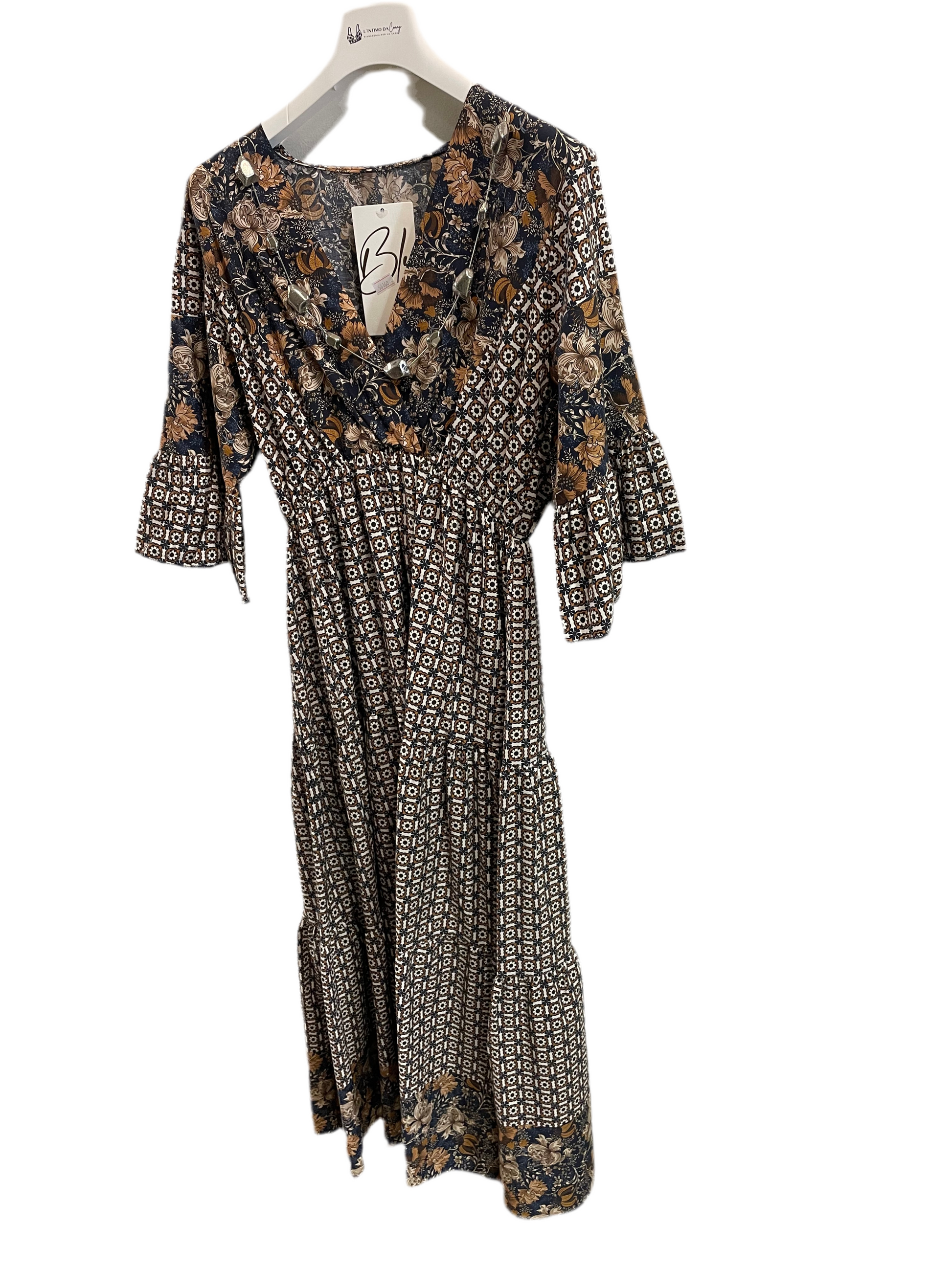 Questo vestito è perfetto per le donne di tutte le taglie grazie alla sua vestibilità unica. Le maniche a tre quarti e l'elastico in vita garantiscono comodità e libertà di movimento, mentre la lunghezza alle caviglie dona una silhouette elegante. Aggiungi un tocco di natura al tuo guardaroba con questo vestito a fiori.